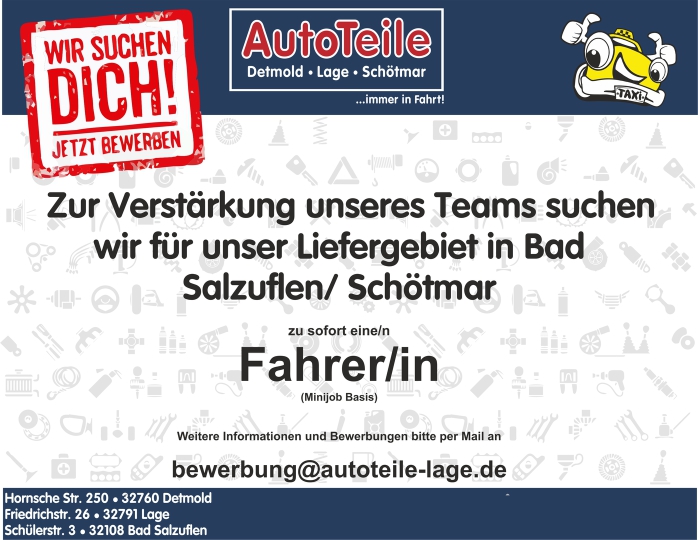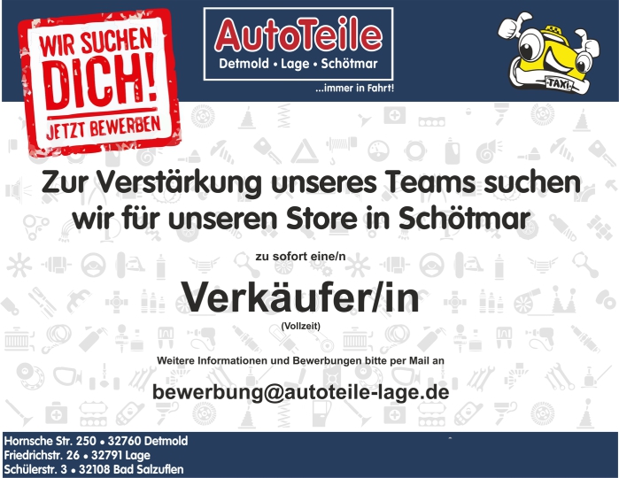 Wir von Autoteile Lage sind seit vielen Jahren der kompetente Partner rund um Auto-, LKW- und Motorradersatzteile, Zubehör, Reifen und Werkstattausrüstung – sowohl regional als auch überregional. In unseren Filialen in Detmold, Lage und Schötmar bieten wir unseren Kunden nicht nur ein breites Sortiment, sondern auch die nötige Beratung und Unterstützung für Pflege, Wartung und Reparatur ihrer Fahrzeuge. Unser Erfolg basiert auf Expertise, Leidenschaft und der engen Zusammenarbeit mit unseren Kunden. Und jetzt suchen wir genau DICH, um mit uns weiter zu wachsen!